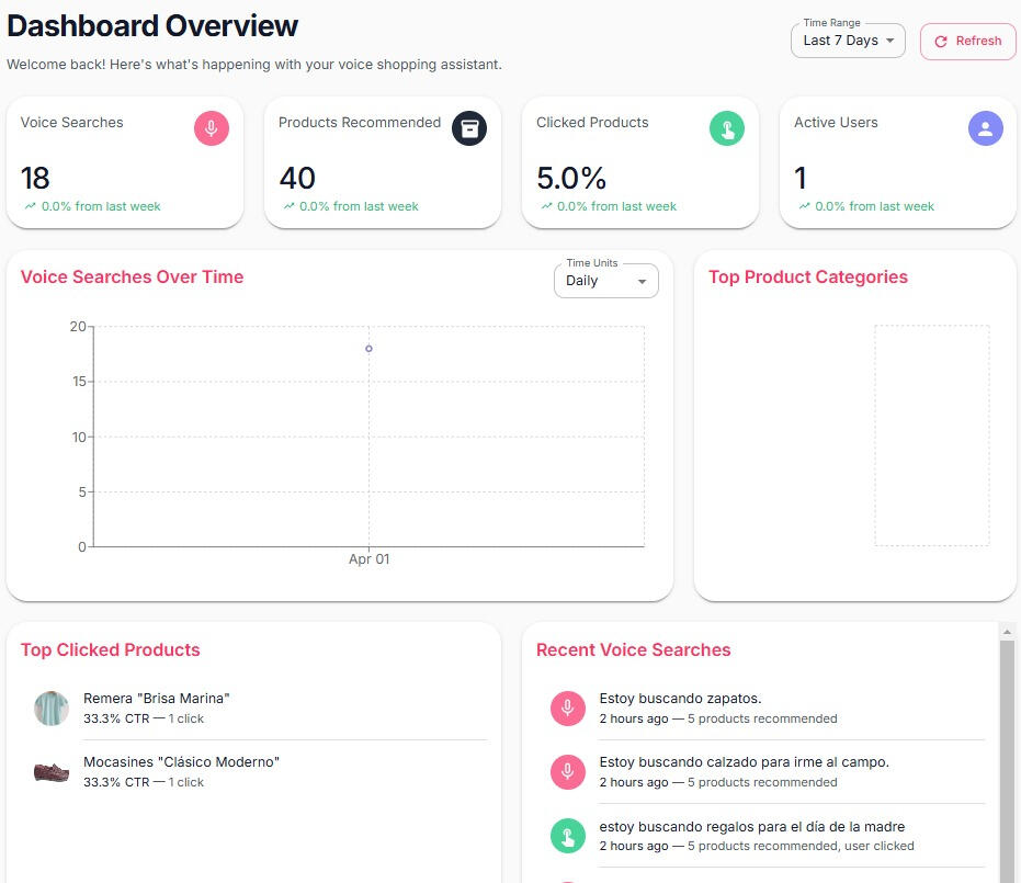 Tendrás un panel donde verás la cantidad de búsquedas por voz, qué buscaron los usuarios y cómo interactuaron con los resultados.¿VoiceShop AI afecta el rendimiento del sitio?